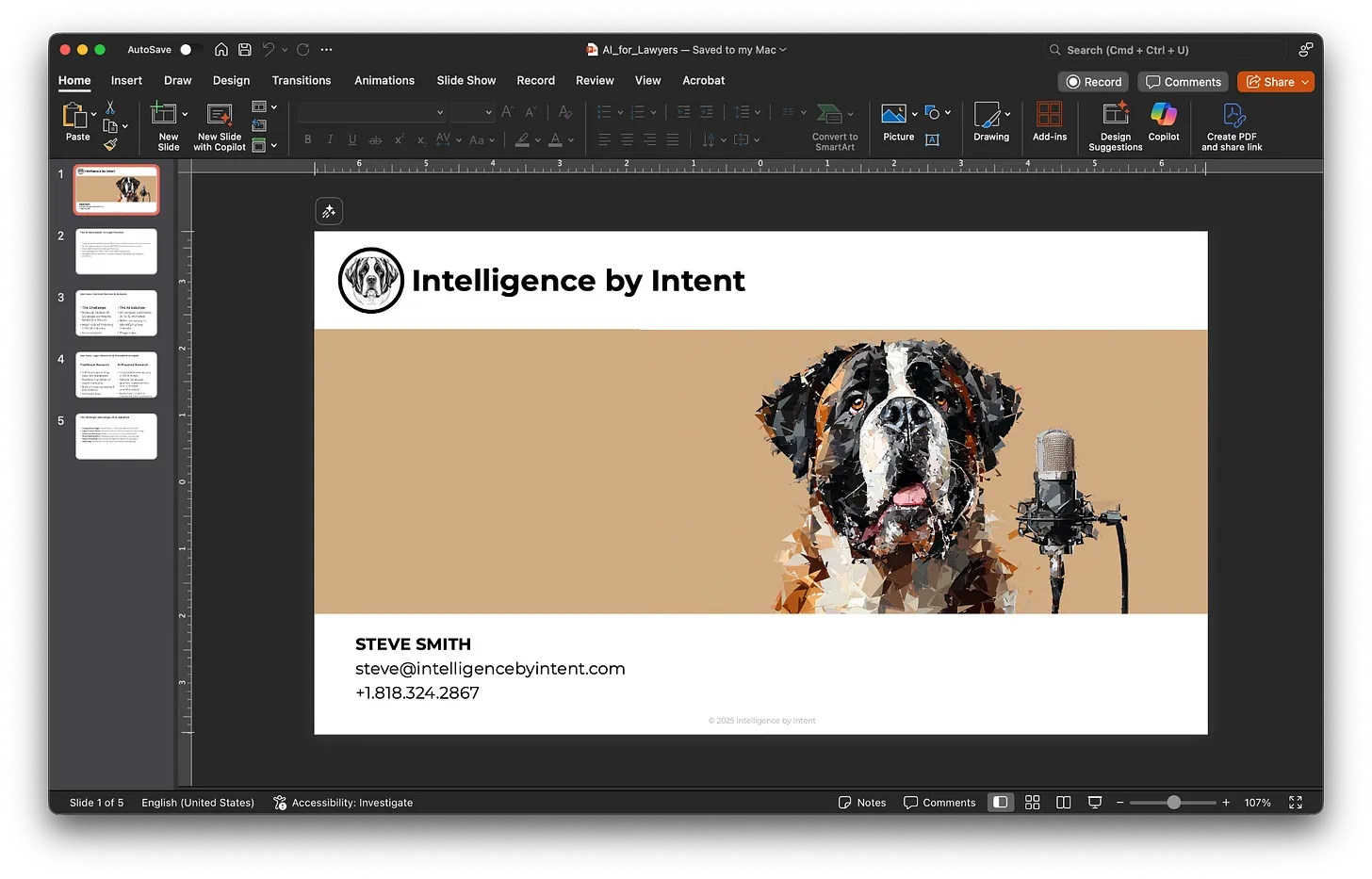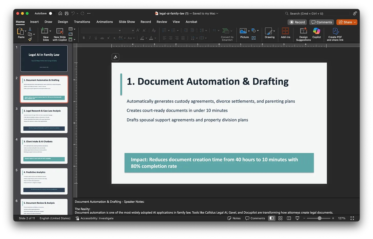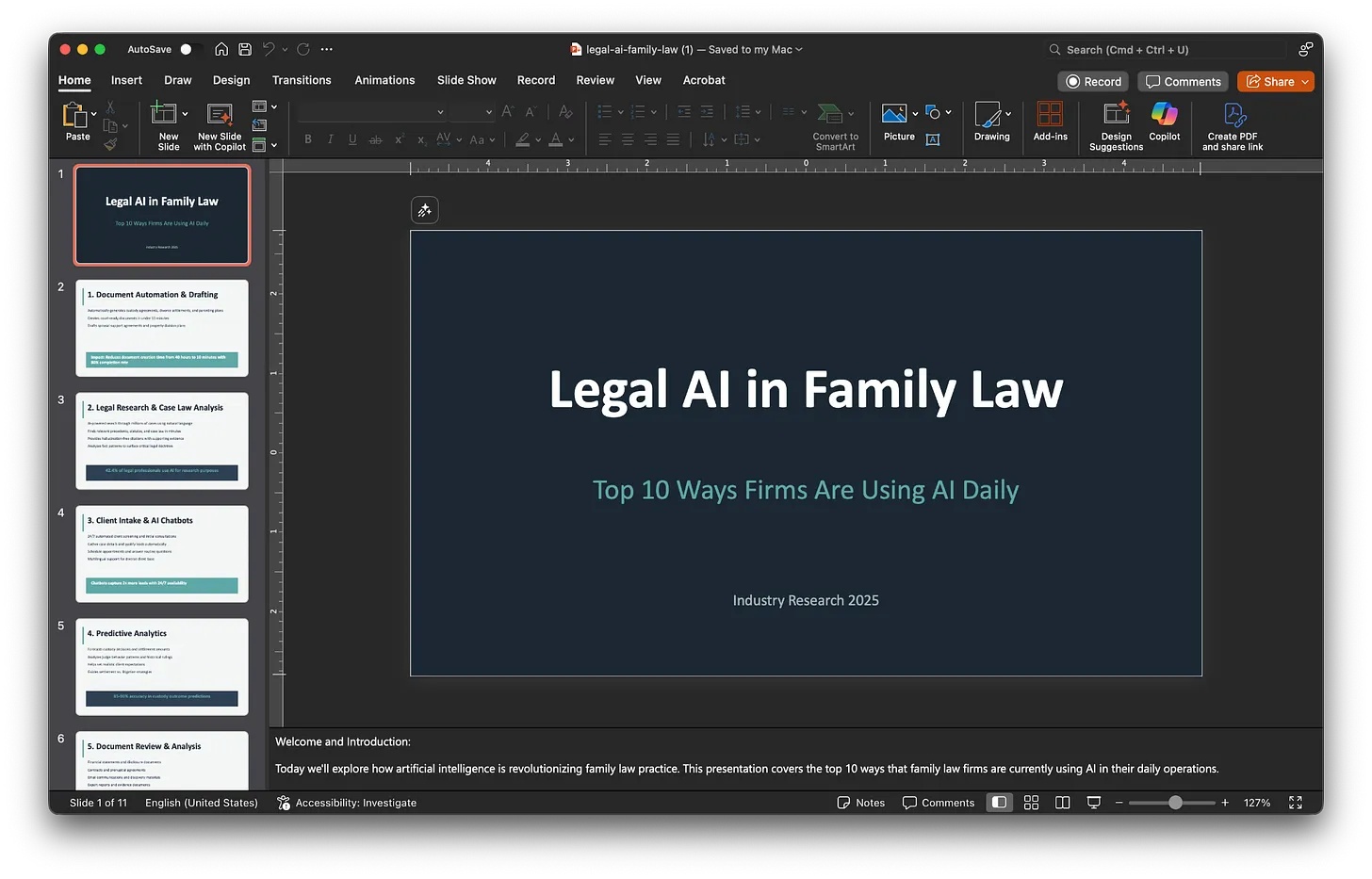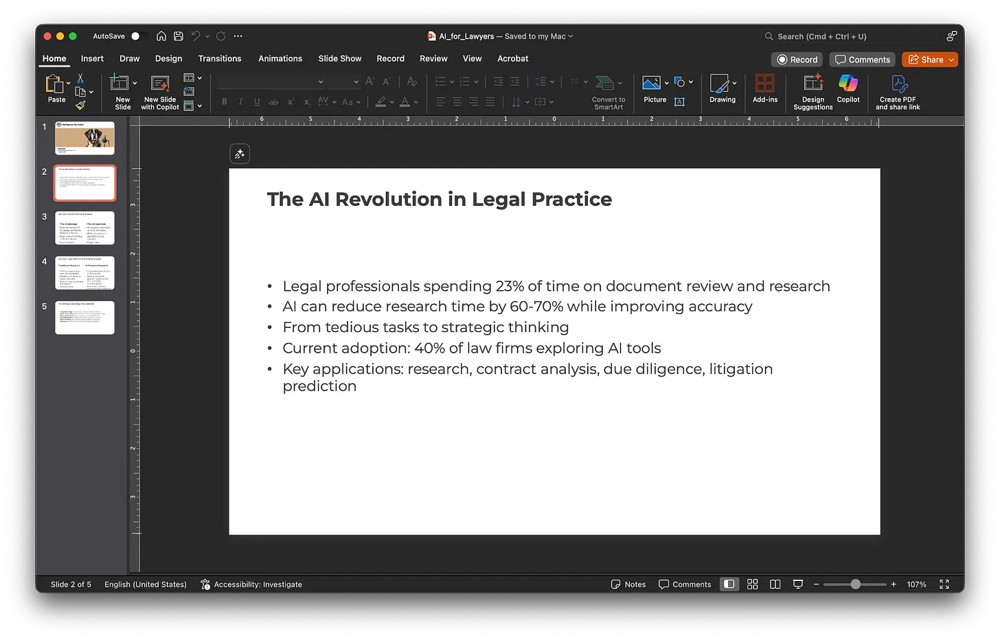 Tôi cần một bài thuyết trình về cách luật sư có thể sử dụng AI. Hãy tạo 5 slide và đảm bảo hai trong số các slide là một trường hợp sử dụng tuyệt vời. Tạo một dàn ý và đối chiếu nó với các slide template tốt nhất từ danh sách.Sau đó, nó sẽ trả về một thông báo tương tự như sau: