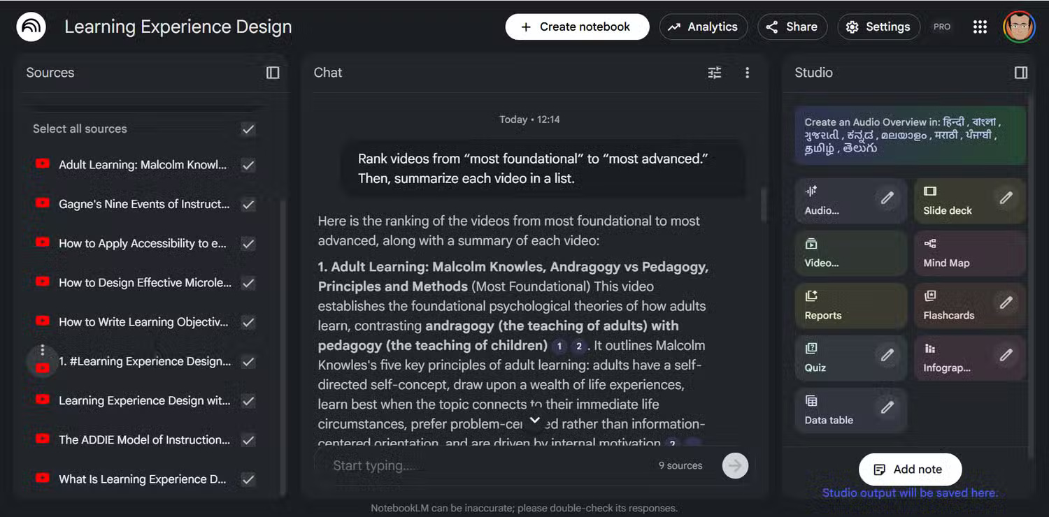 Hãy yêu cầu NotebookLM tóm tắt và xếp hạng các video từ “cơ bản nhất” đến “nâng cao nhất”. Các bản tóm tắt rất chính xác, nhưng NotebookLM không phải lúc nào cũng xếp hạng video chính xác. Những bản tóm tắt giúp xây dựng một thứ tự xem hợp lý, tăng dần độ phức tạp. Hãy nhớ rằng, NotebookLM không sắp xếp các nguồn tài liệu theo trình tự trong thanh bên. Vì vậy, việc sắp xếp theo thứ tự logic này cùng với việc đổi tên thủ công trong thanh bên chỉ là một phương pháp.