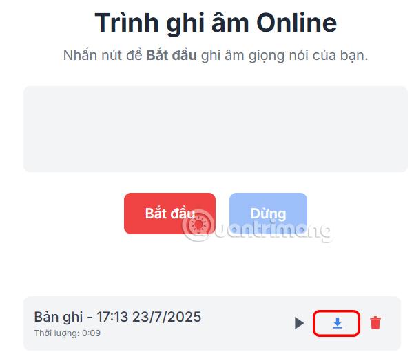 Bản ghi âm hiển thị ở bên dưới, để tải xuống đoạn ghi âm bạn nhấn vào biểu tượng download là được. Muốn nghe thì nhấn biểu tượng play, muốn xóa nhấn biểu tượng thùng rác.