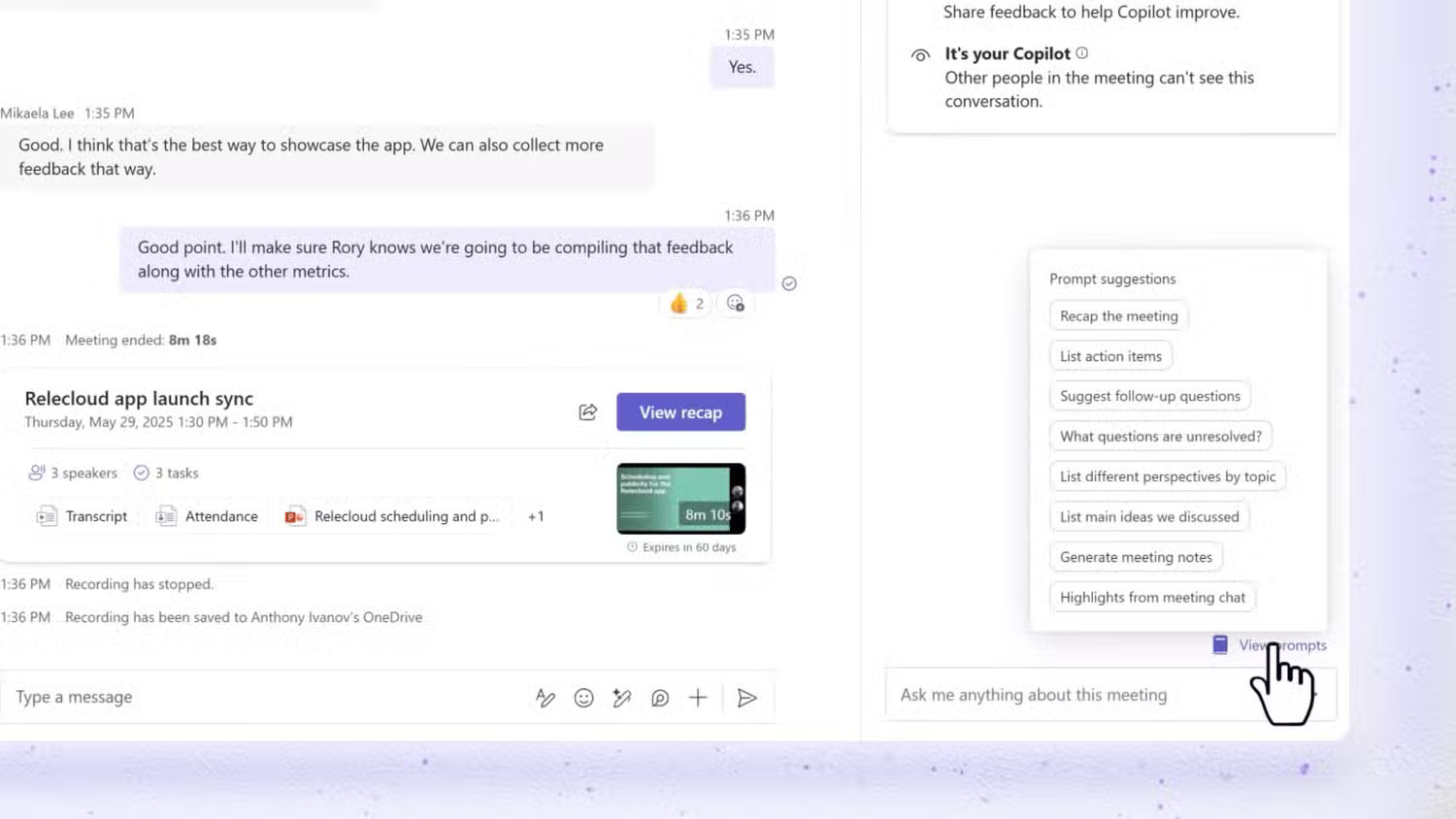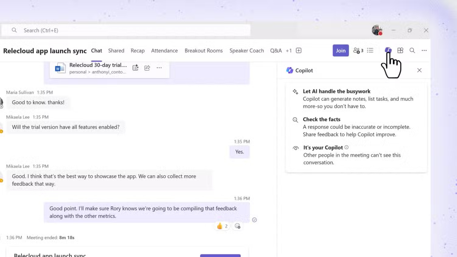 Copilot cũng đi kèm với các tính năng thực sự quan trọng. Ví dụ, hãy tưởng tượng bạn đăng nhập vào cuộc họp Microsoft Teams muộn 15 phút. Giờ đây, nhờ Copilot, thay vì hỏi mọi người bạn đã bỏ lỡ điều gì, bạn chỉ cần hỏi Copilot. Nó hoạt động như trợ lý cuộc họp cá nhân của bạn.
