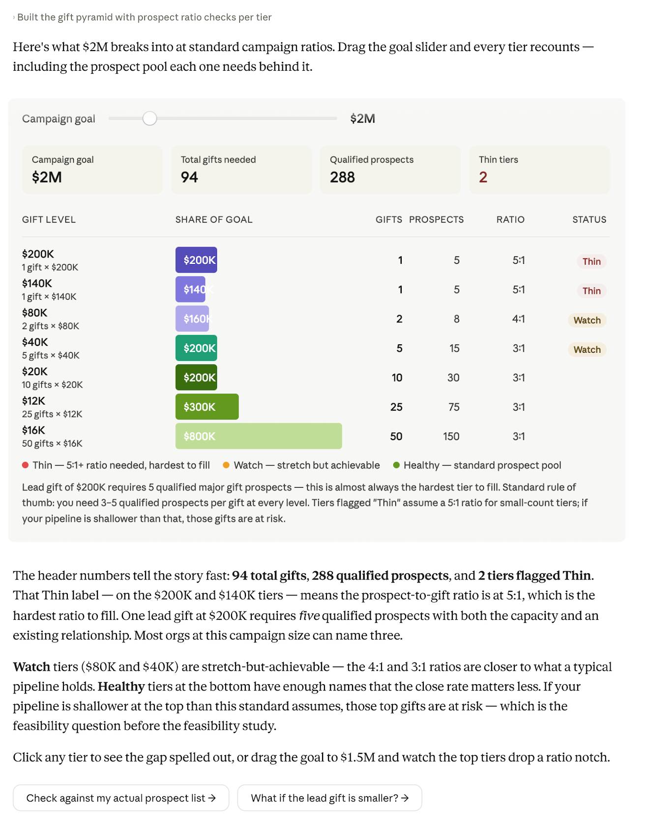 Chúng ta đang xem xét một chiến dịch với số vốn 2 triệu USD. Hãy cho tôi thấy kim tự tháp triển khai cần thiết trông như thế nào, nghĩa là cần bao nhiêu nhà tài trợ ở mỗi bậc và có bao nhiêu nhà tài trợ tiềm năng đủ điều kiện cho mỗi bậc. Hãy cho phép tôi kéo mục tiêu và xem hình dạng thay đổi, đồng thời đánh dấu các cấp độ mà tôi có thể đang thiếu hụt.2. Cung cấp ngữ cảnh cho Claude