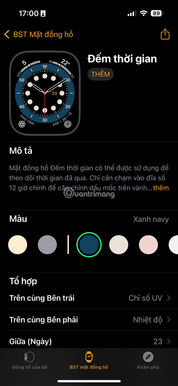 Đi tới tab BST mặt đồng hồ trong ứng dụng Watch để xem tất cả các mặt có sẵn cho Apple Watch. Chọn một mặt để xem thêm thông tin và tùy chỉnh nó bằng màu sắc, các complication, v.v... Nhấn Thêm để đưa nó lên Apple Watch của bạn.