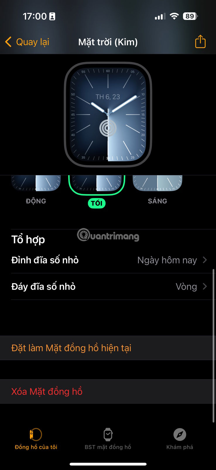 Để biết chính xác mọi thứ sẽ trông như thế nào, mặt ở đầu trang này sẽ thay đổi với các lựa chọn khác nhau. Bạn có thể nhấn Đặt làm mặt đồng hồ hiện tại ở cuối menu này để nhanh chóng thêm mặt tùy chỉnh vào Apple Watch. Và nếu muốn xóa thì chọn Xóa mặt đồng hồ.