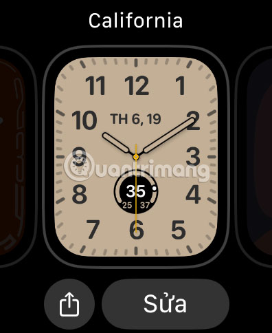 Khi hoàn tất việc tạo mặt Apple Watch hoàn hảo, bạn có thể khoe với những người dùng đồng hồ khác bằng cách chia sẻ nó. Cách tốt nhất để chia sẻ mặt đồng hồ là nhấn và giữ mặt đồng hồ hiện tại và nhấn vào biểu tượng chia sẻ bên dưới mặt đồng hồ đó. Bạn sẽ thấy tên mặt đồng hồ và số lượng complication của nó. Sau đó, có thể gửi email hoặc nhắn tin cho người dùng khác.
